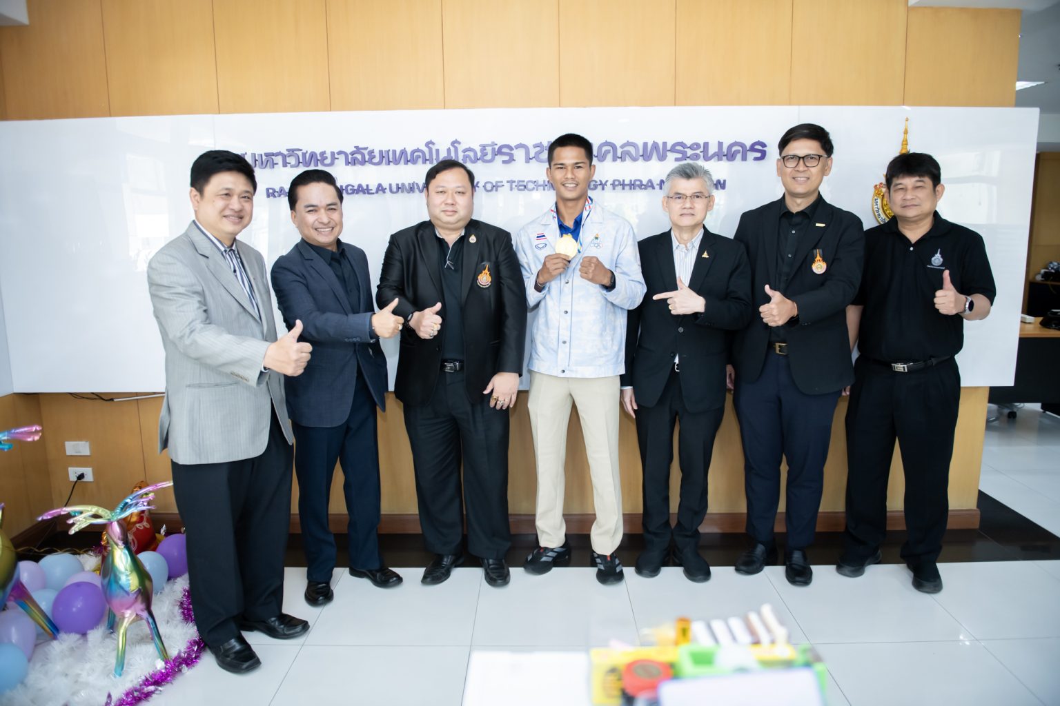 Dr.Natworapol Rachsiriwatcharabul, Acting President of Rajamangala University of Technology Phra Nakhon (RMUTP), together with Asst. Prof. Dr. Amnat Iamsa-ard, Assistant President, extended their congratulations to Sergeant Major First Class Abdolmalek Thingnamrob, also known as Thanuphet Wor. Sangprapai, an alumnus of the Applied Thai Language Program, Faculty of Liberal Arts, RMUTP, on winning a **gold medal in amateur Muay Thai at the 33rd SEA Games. The congratulatory meeting was held at the Office of the President, Thewet Campus, on 25 December 2025.