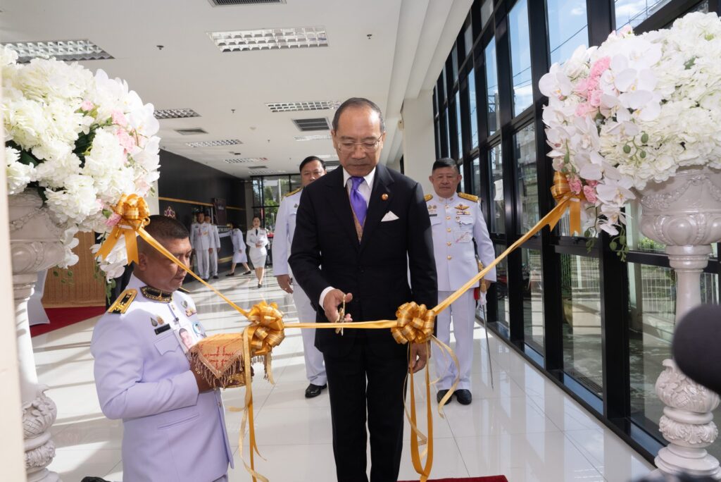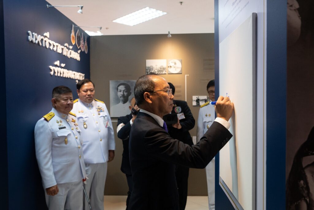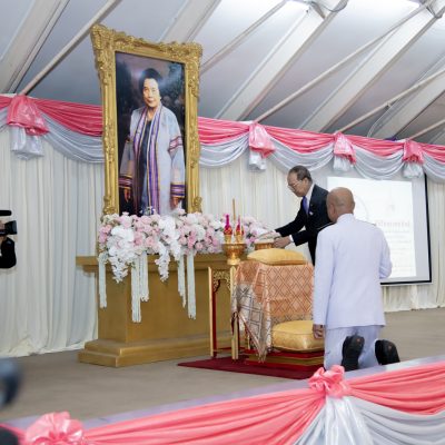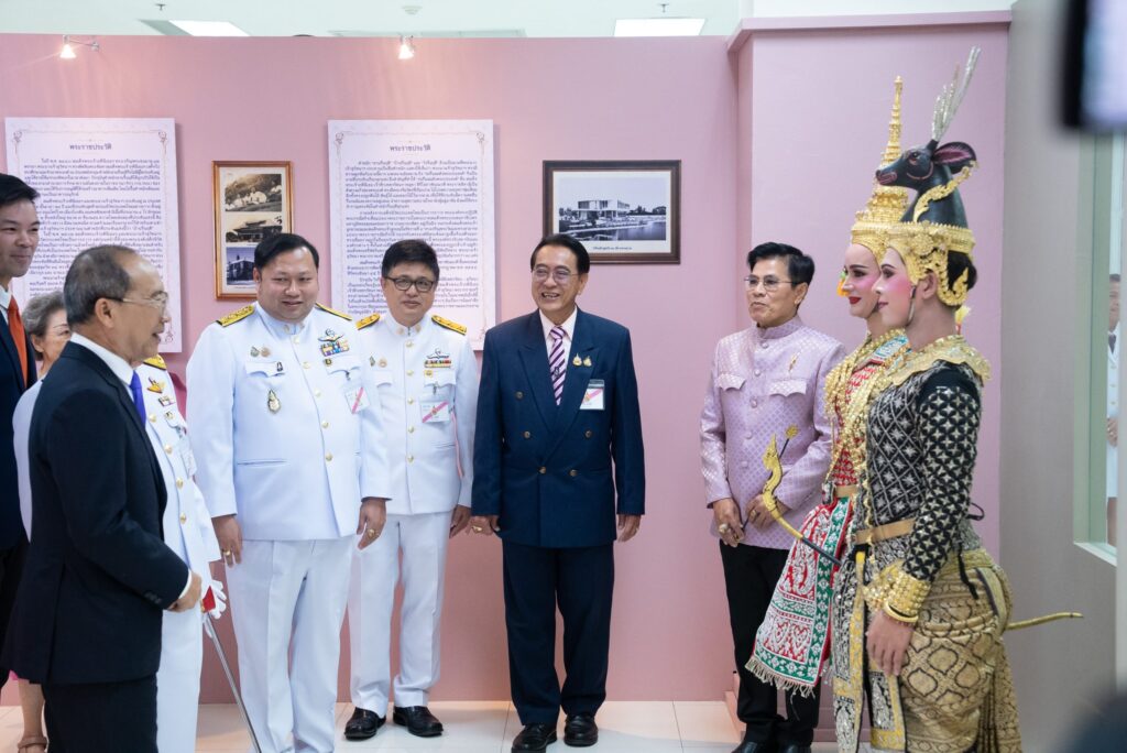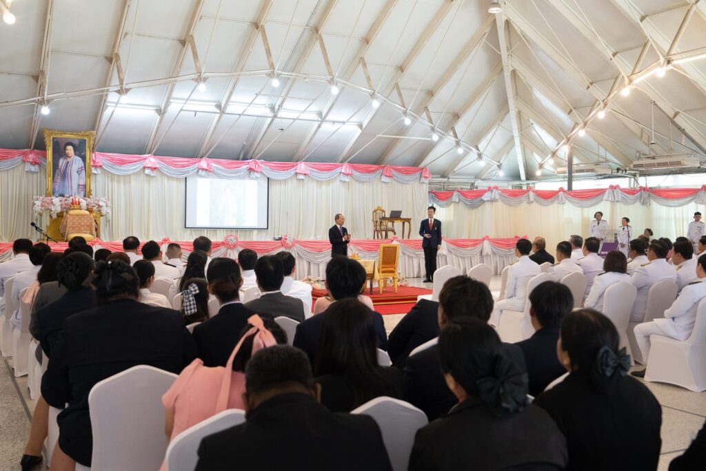 Later, General His Serene Highness Prince Chalermsuk Yukol proceeded to the Ratchaburi Direkrit Building, where His Serene Highness presided over the opening ceremony of two exhibitions — “Maha Dheeraraja Phiphawan: Rapeepat Legal Legacy”, held in honor of King Vajiravudh (Rama VI) on the 100th day of His Majesty’s passing, and “Sirisosapakhesin: The Artistic Heritage of Her Royal Highness Princess Petcharat Rajasuda Sirisopaphannawadee”, commemorating the 100th anniversary of Her Royal Highness’s birth. His Serene Highness also graciously viewed the exhibitions afterward. Subsequently, His Serene Highness proceeded to D-Hall Auditorium, where His Serene Highness lit candles and incense as a gesture of reverence before the portrait of Her Royal Highness Princess Petcharat Rajasuda Sirisopaphannawadee, on the occasion of Her Royal Highness’s centennial birth anniversary. On this occasion, His Serene Highness presented a commemorative gift to Associate Professor Dr. Chatchapol Chaiporn, Deputy Secretary-General of the King Vajiravudh Memorial Foundation under Royal Patronage, and a member of the Petcharat–Suwattana Foundation, who had graciously delivered a special lecture titled “The Royal Conduct and Aesthetic Preferences in Architecture of Her Royal Highness Princess Petcharat Rajasuda Sirisopaphannawadee.”