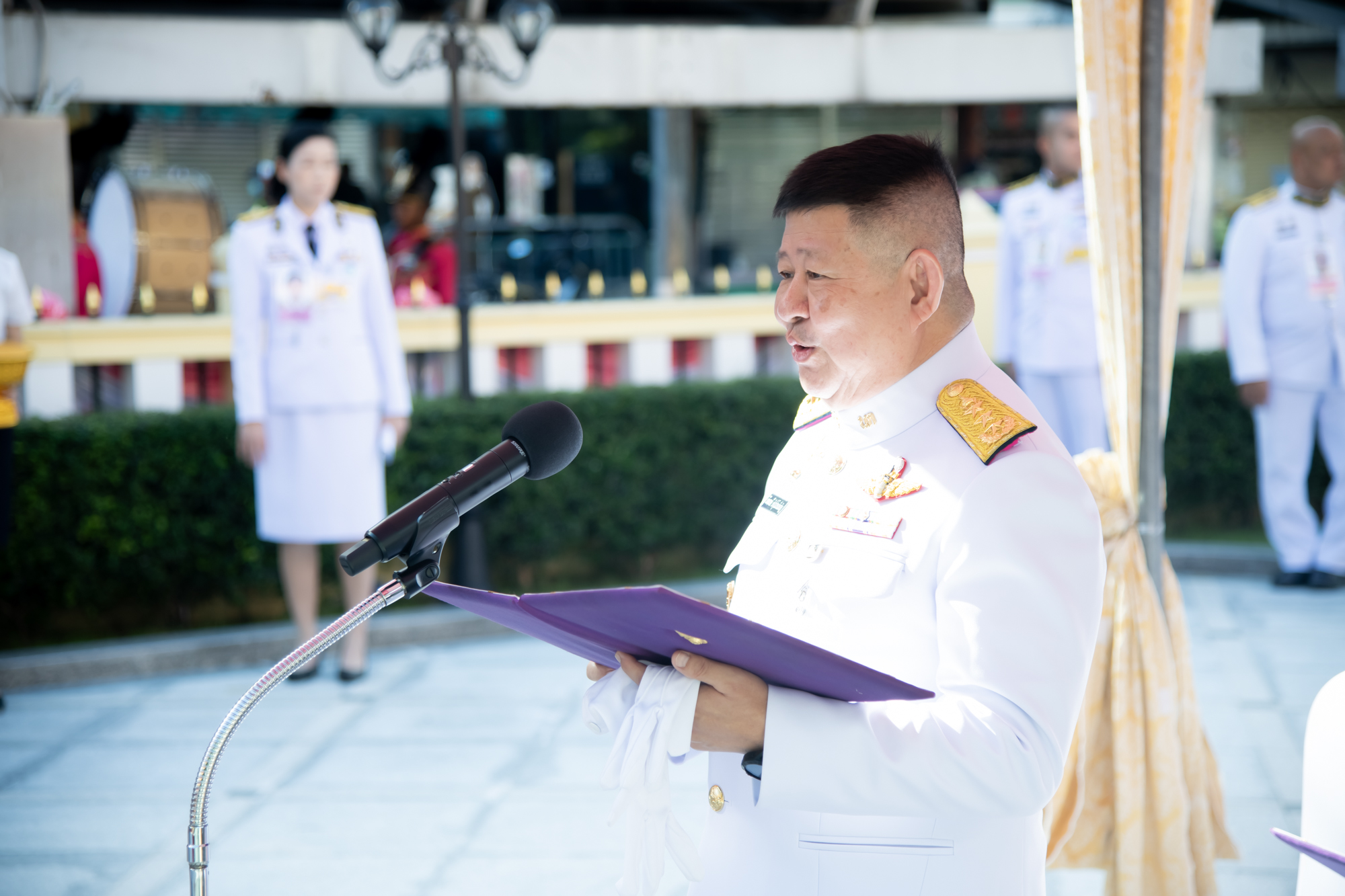Lieutenant General Chainarong Kitrungrojcharoen,, Vice President of the University Council, acting on behalf of the President of the Council, delivered a speech stating, “On behalf of the University Council of Rajamangala University of Technology Phra Nakhon, we are profoundly grateful for His Serene Highness’s gracious presence in presiding over the opening of the Monument Plaza of His Royal Highness Prince Rabi of Ratchaburi (Krom Luang Ratchaburi Direkrit) and inaugurating the Royal Celebration Project in honor of His Majesty King Vajiravudh (King Rama VI) and Her Royal Highness Princess Petcharat Rajasuda Sirisopaphannawadee. This occasion is a great honor for Rajamangala University of Technology Phra Nakhon and a mark of immense royal benevolence toward the university’s administrators, faculty, staff, and students.”