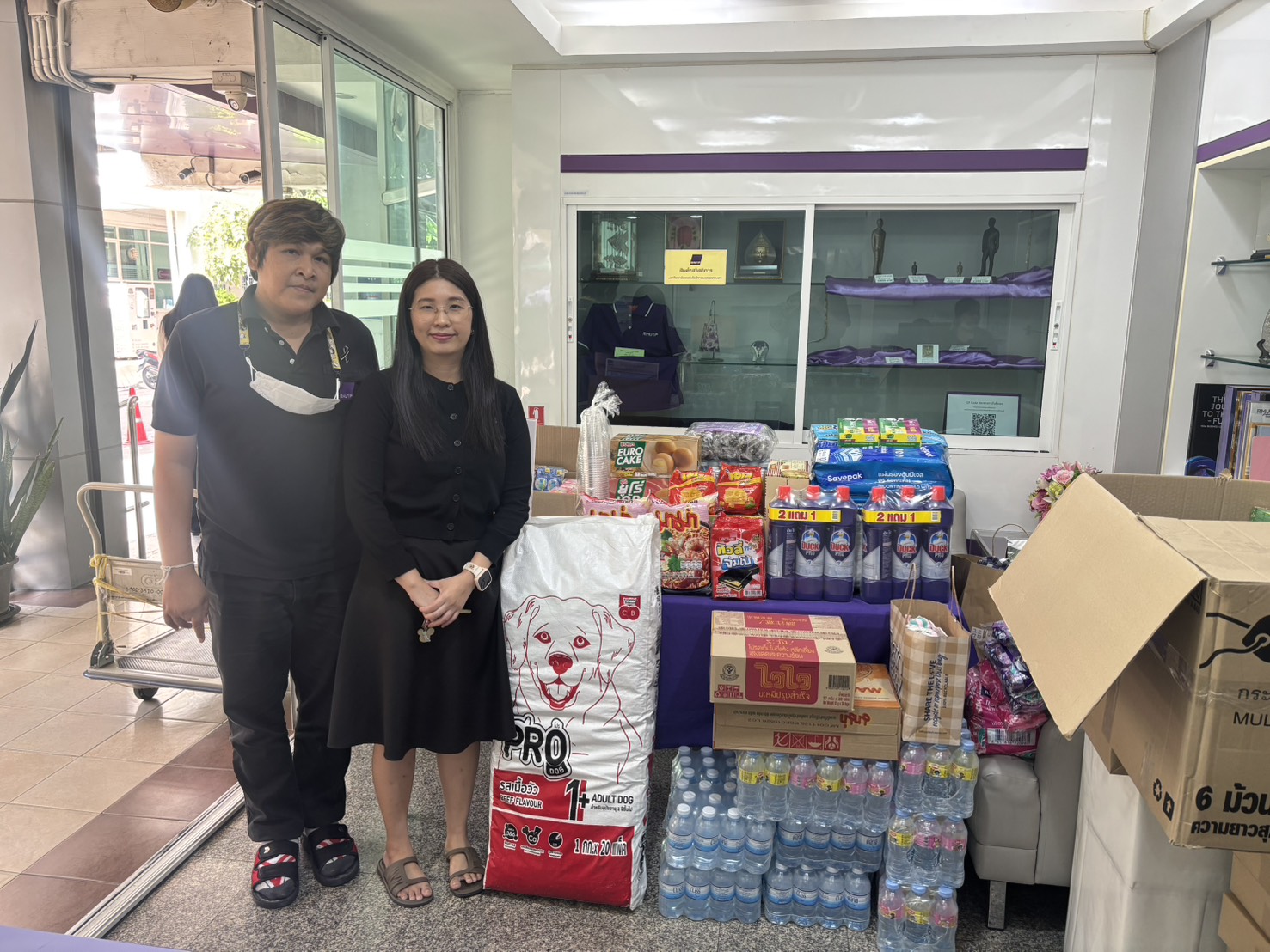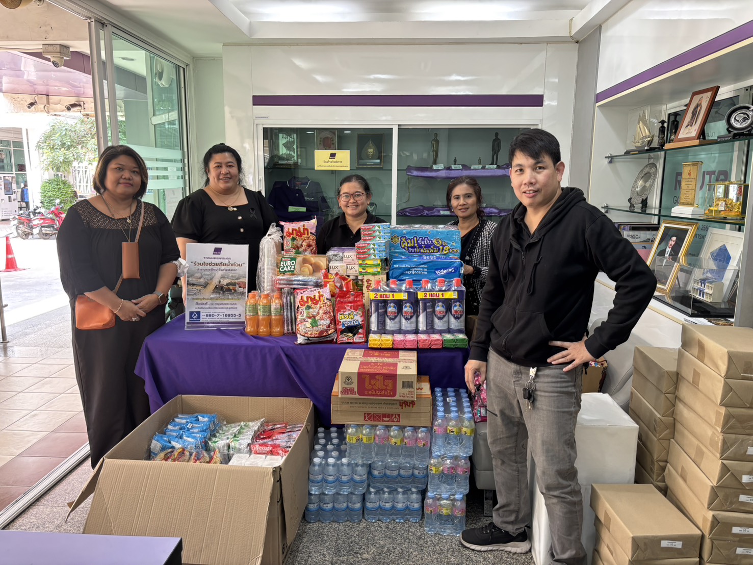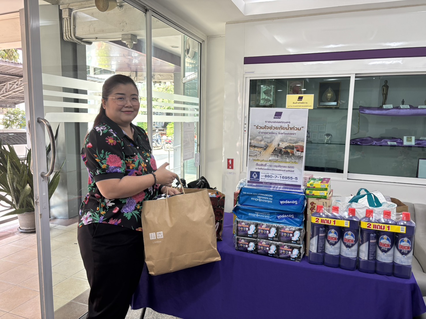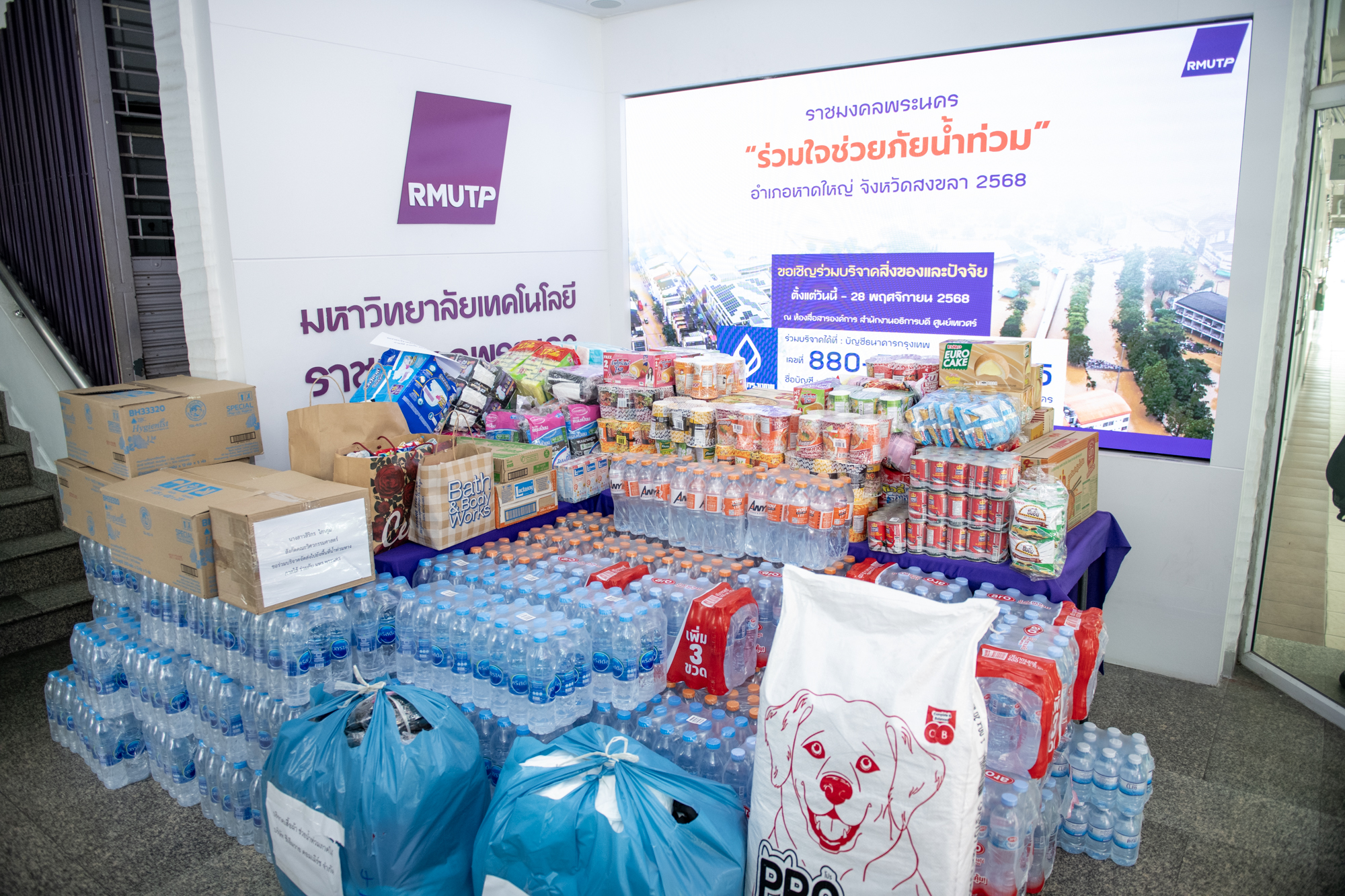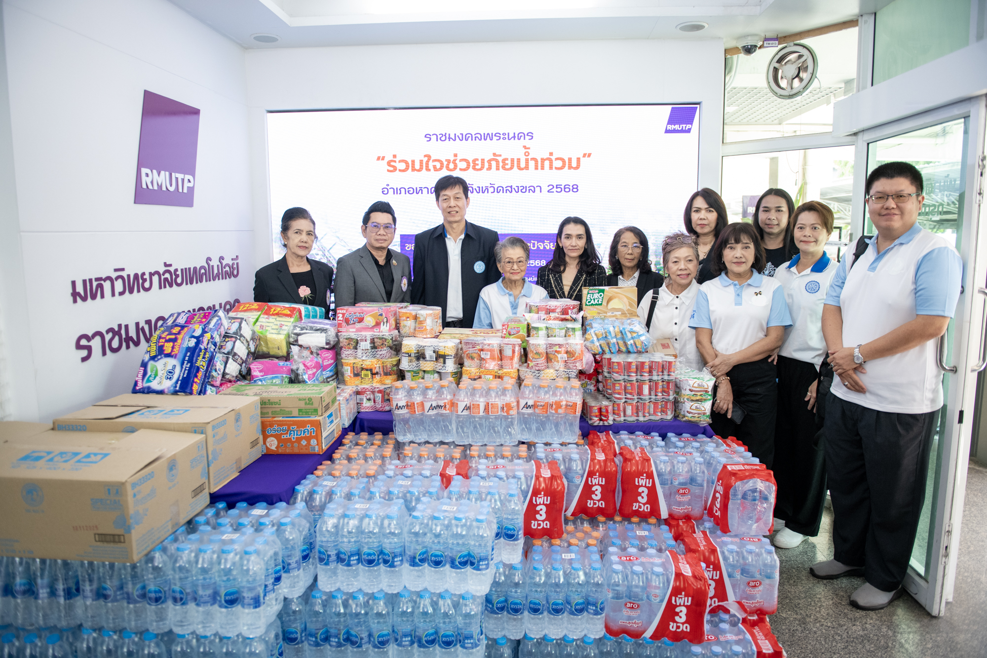 Following the University’s donation campaign to collect essential relief items—such as rice, dry food, instant noodles, canned fish and canned food, sanitary pads, soap, and toothpaste—a large number of staff members contributed generously. Most recently, a representative from CMY Commerce Co., Ltd. donated 400 T-shirts in assorted sizes, approximately 50 pairs of short and long trousers, as well as around 100 pieces of men’s and women’s underwear. On this occasion, Mr.Bundit Panraksa, President of the Alumni Association of Rajamangala University of Technology Phra Nakhon, acting as the University’s representative, delivered the donated consumer goods to flood victims in southern Thailand through the Thamdee Organization Foundation. In addition, the monetary donations collected were presented to Rajamangala University of Technology Srivijaya to further support flood relief efforts.