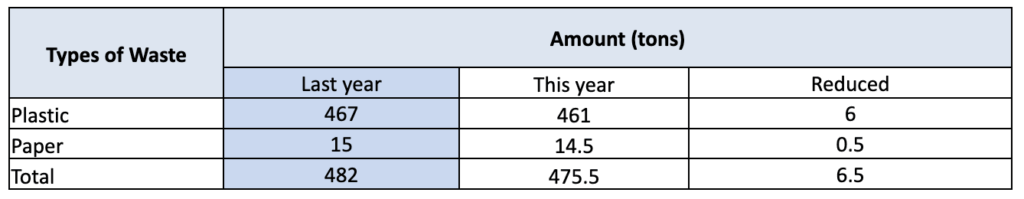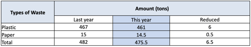 The table below summarizes the amount of waste generated on campus last year compared to this year, highlighting the reduction achieved in both office/classroom-related paper waste (including a small portion of packaging and hard paper) and plastic waste primarily collected from outside the classroom.