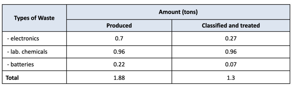 Of this total, 1.3 tons (69.15%) were properly classified and treated through certified hazardous waste management channels. This included the full 0.96 tons of laboratory chemicals, which were securely packaged and transferred to a licensed hazardous waste company, along with 0.27 tons of electronic equipment and 0.07 tons of used batteries that were safely collected for treatment. These actions are essential for mitigating the environmental and health risks associated with hazardous materials.