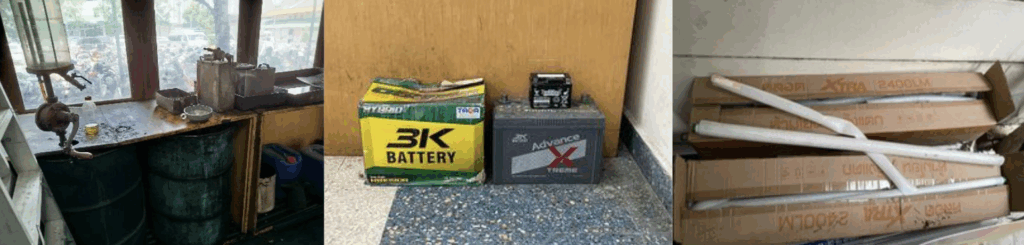 Toxic waste: lab chemicals and oils, electronic equipment, and batteries.